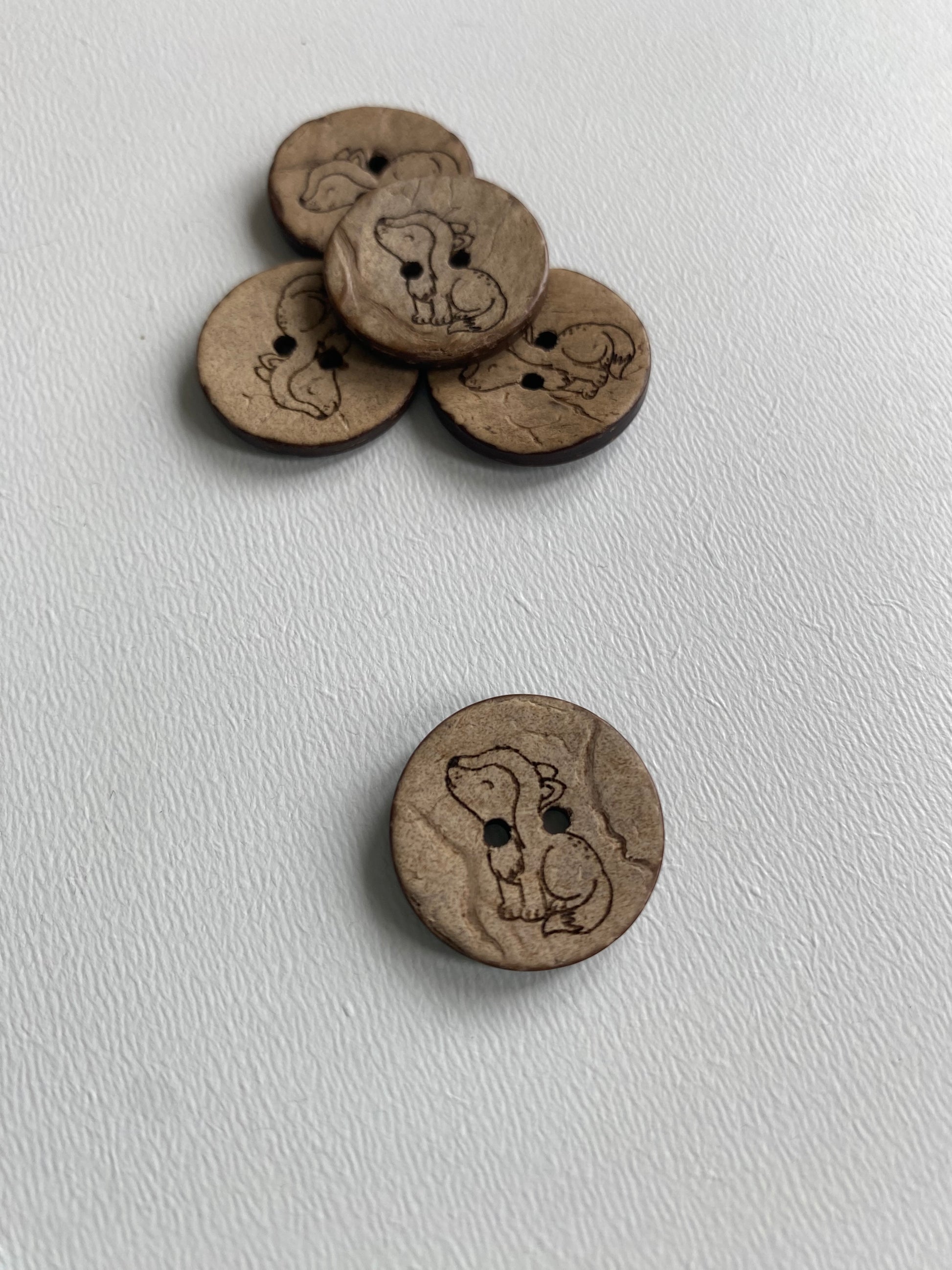 Wunderschöne Kokosknöpfe mit einem süßen Wolf. Verschönere hiermit deine genähten Projekte und mache Sie so noch einzigartiger!